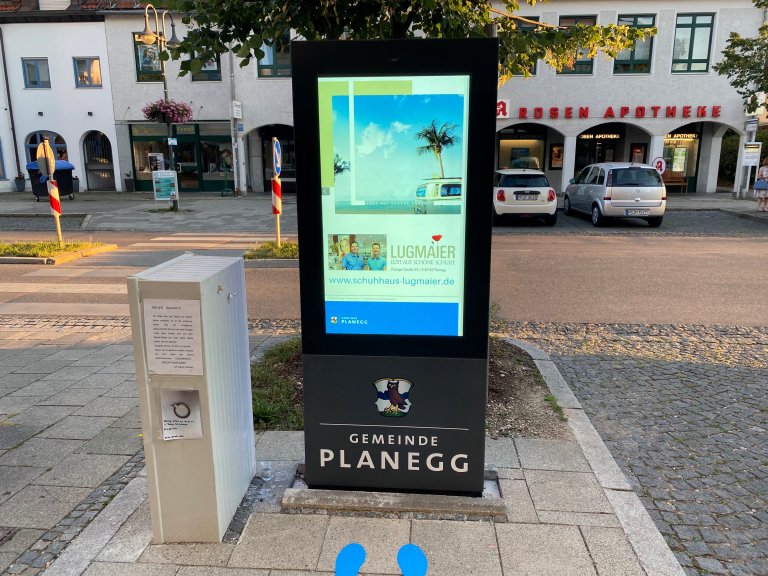 Mit der Möglichkeit auf dem Info-Point kostenfreie Werbung zu schalten, geht Planegg einen Schritt weiter. Wir bieten dem den regionalen Anbietern eine Bühne, die im öffentlichen Raum sichtbar ist. Quasi im Vorbeigehen nehmen die Bürger und Bürgerinnen die große Vielfalt des lokalen Einzelhandels auf. Bei über 800 Neubürgern pro Jahr ist es nämlich nicht selbstverständlich, dass alle Geschäfte gleichermaßen bekannt sind.